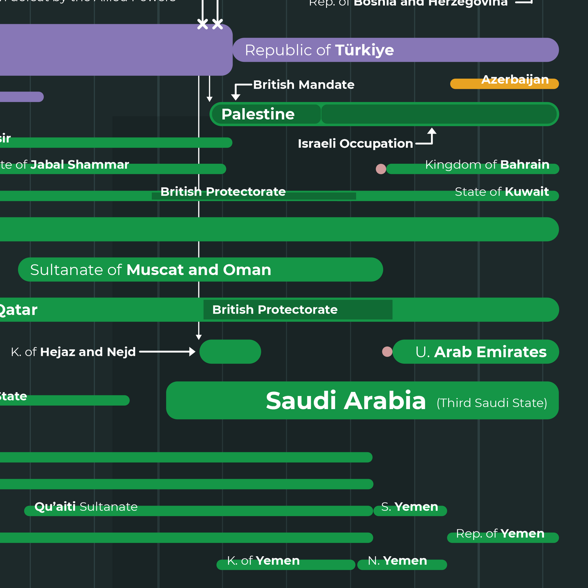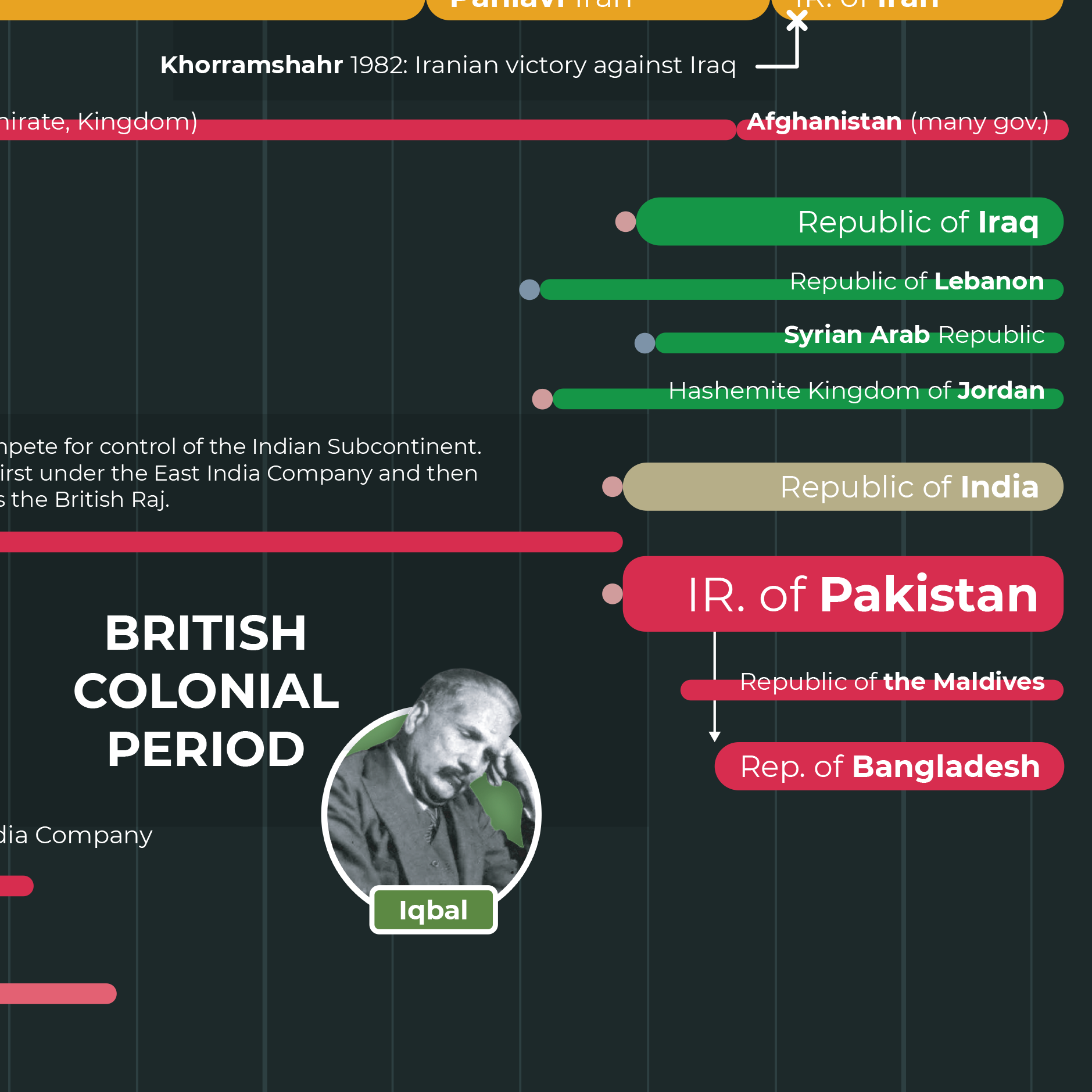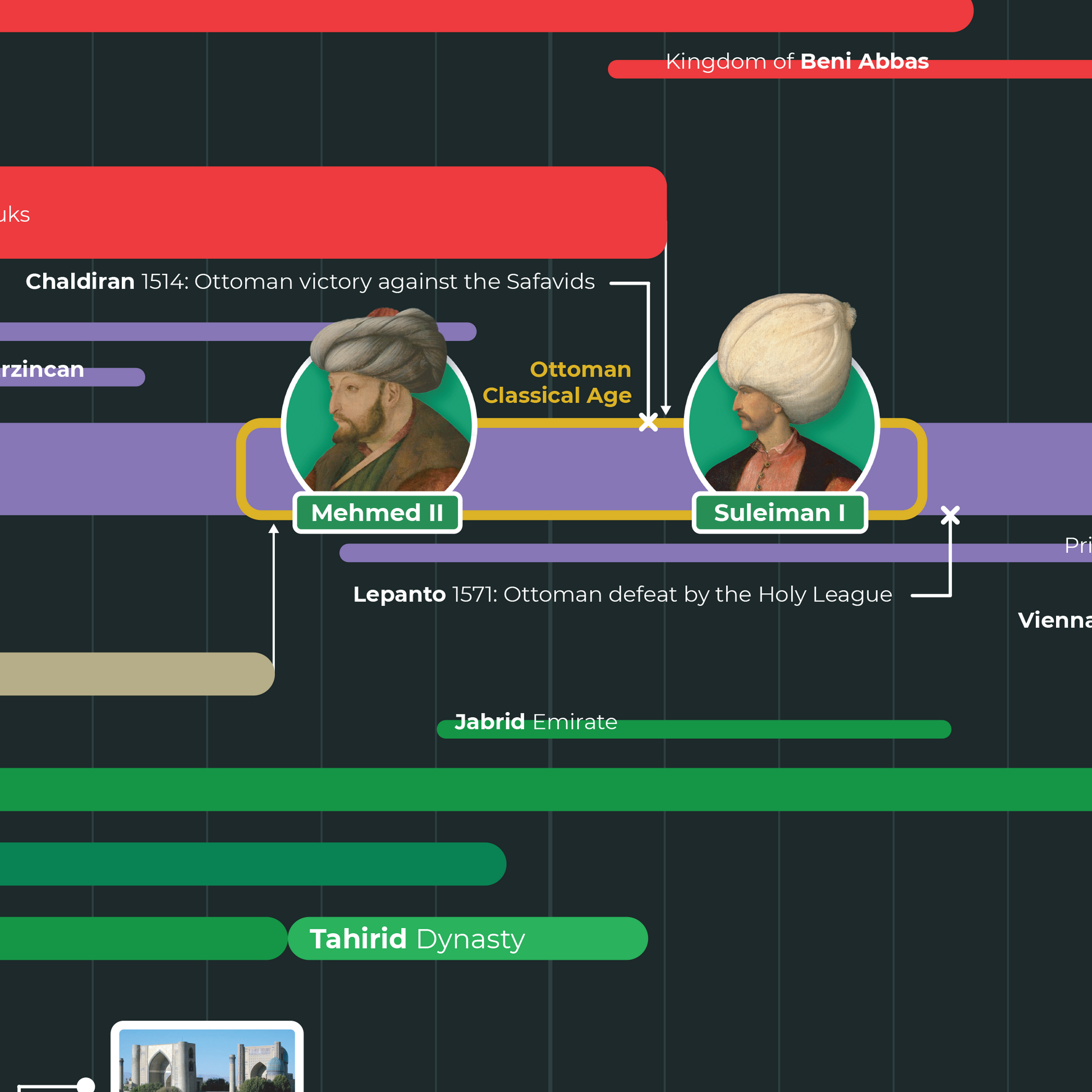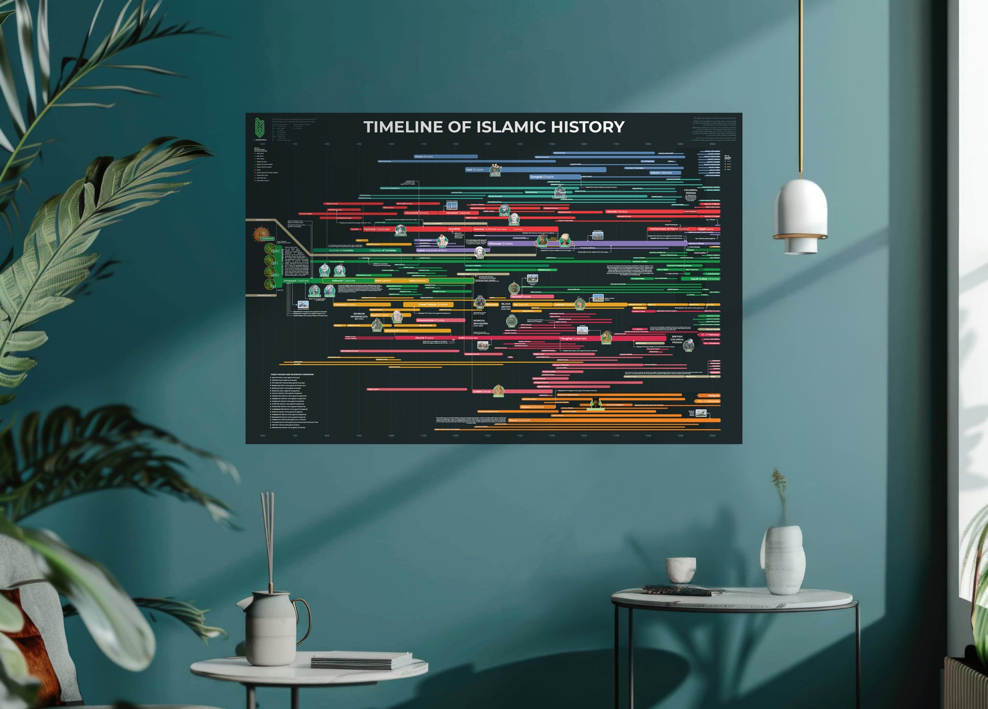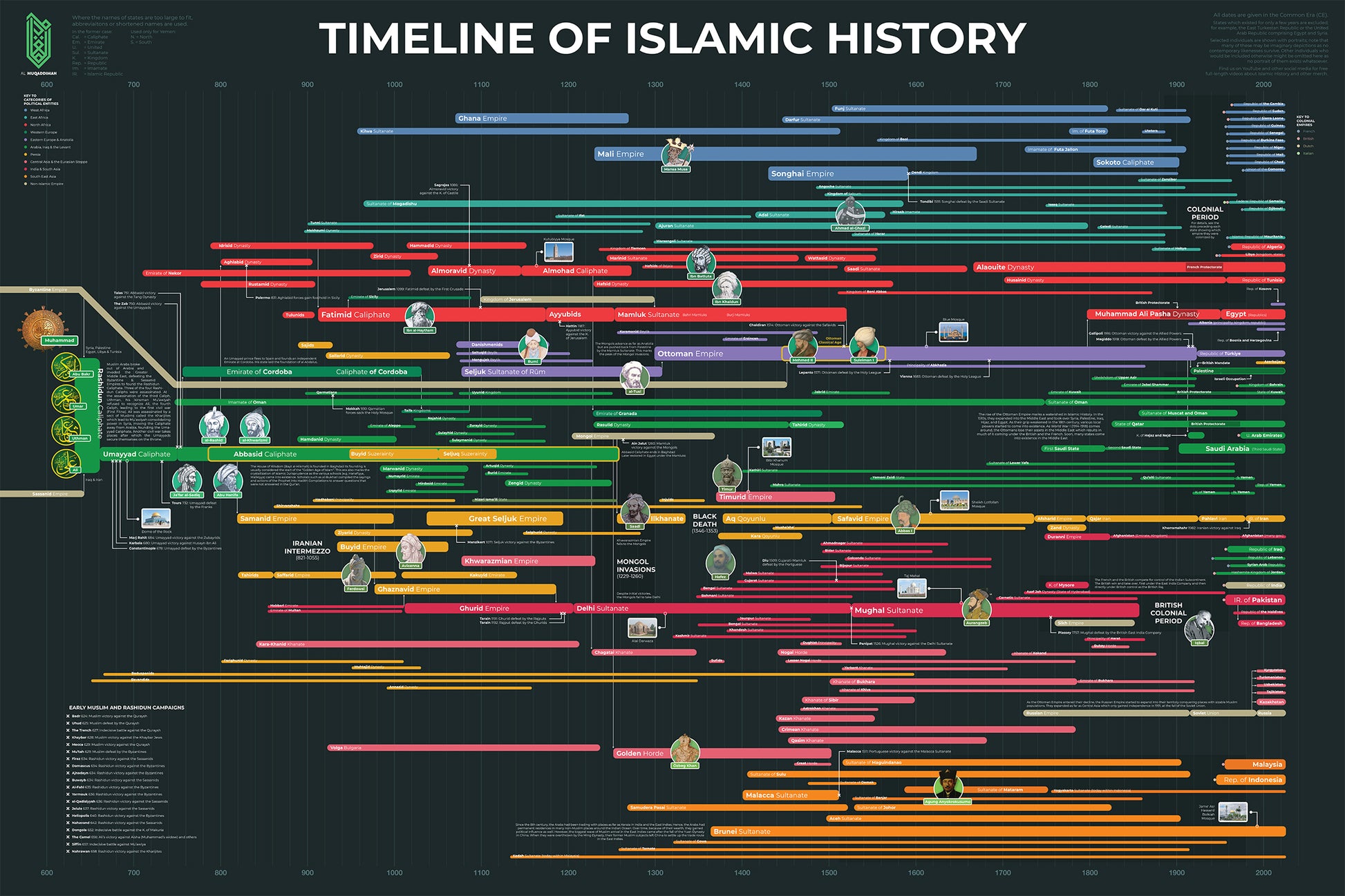 Covering over 1400 years of Islamic History, this sturdy 24x36" wallchart displays all the major empires, kingdoms, emirates, and caliphates throughout history in a side-by-side format so that the viewer can quickly see how different events in different places relate to one another. A conscious effort has been made to make the chart less focused on Middle Eart than other such timelines and to incorporate less-represented areas of the Islamic World such as East Asia and Sub-Saharan Africa.